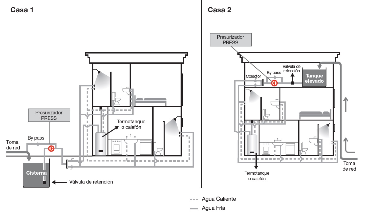 Aumento de la presión de agua en viviendas en general con cisterna o tanque elevado. Bajo consumo, seguridad y confiabilidad. Hasta 4 plantas y 8 duchas