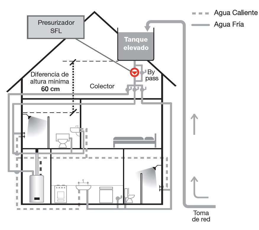Aumento de presión de agua en residencias en general, nuevas o antiguas con tanque elevado. Apto para viviendas con tuberías de 20 años o más. Hasta 3 duchas.